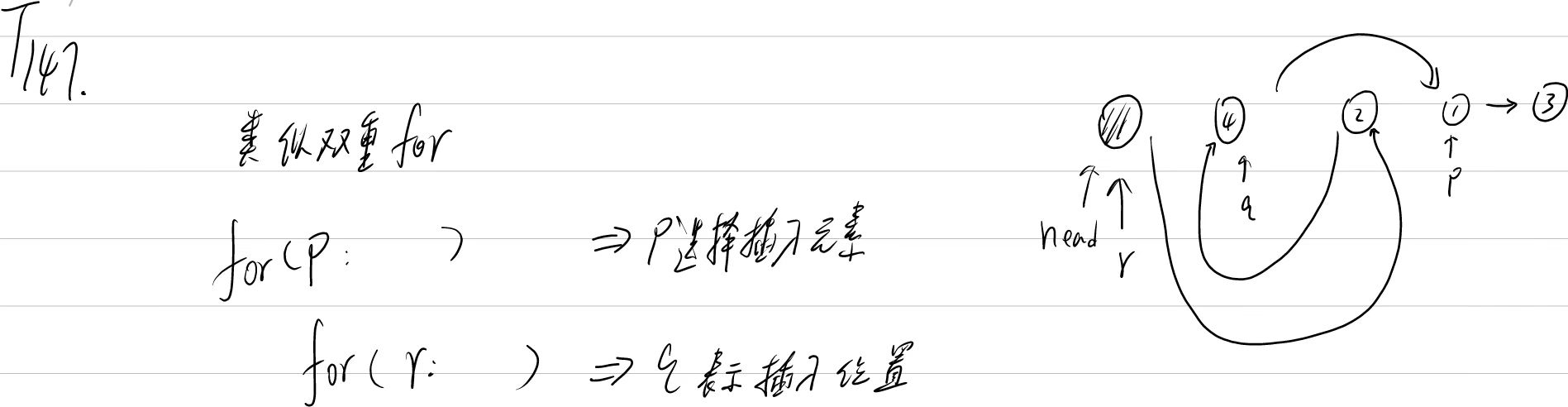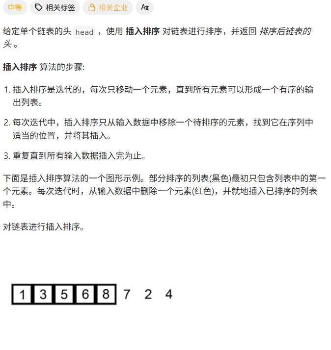 class Solution {public ListNode insertionSortList(ListNode head) {ListNode p = head.next;ListNode q = head;ListNode r = new ListNode(0, head); //哨兵head = r;while(p != null){//进行插入if(p.val < q.val){ //需要插入的情况while(r != q){if(r.next.val > p.val){ //在r后插入pq.next = p.next;p.next = r.next;r.next = p;p = q.next;break;}r = r.next;}r = head;}else{ //不需要插入的情况q = p;p = p.next; }}return head.next;}