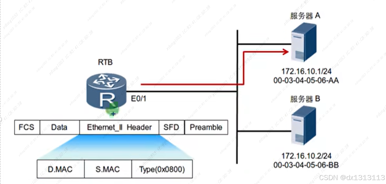 - 服务器A接收到该数据帧后,发现目的MAC地址为自己的MAC地址,于是接收该帧