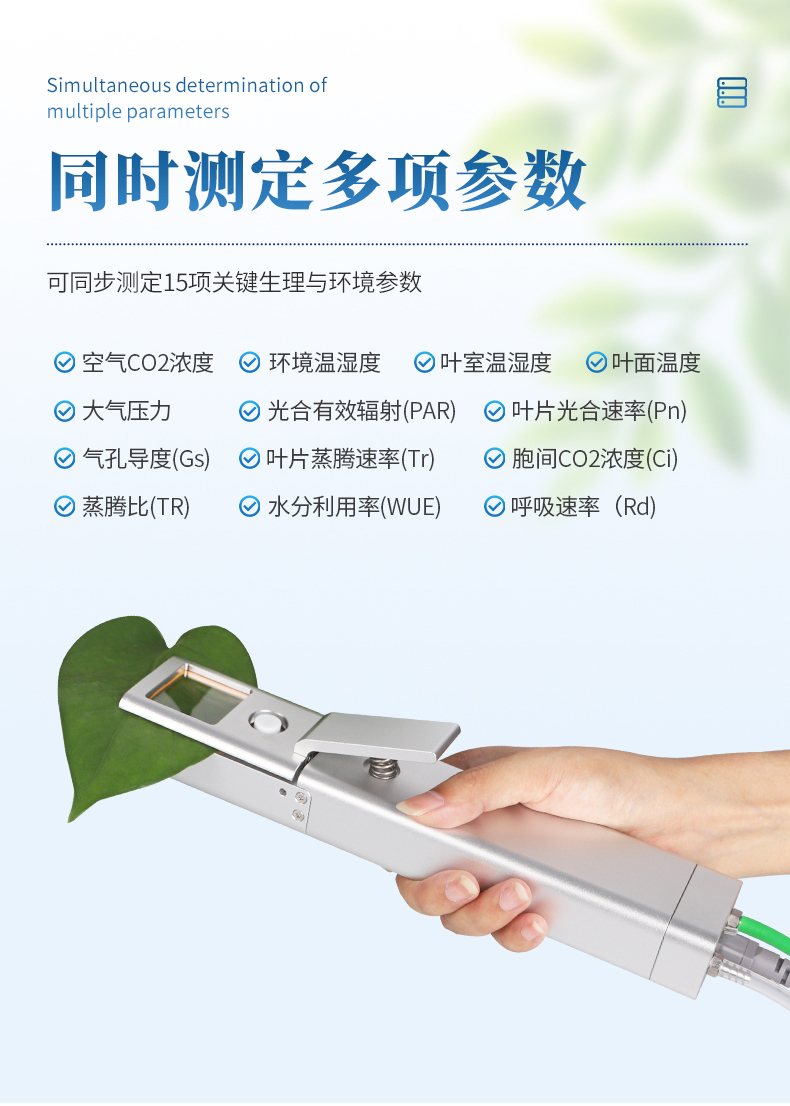 光合仪采用非扩散式红外二氧化碳分析技术,结合多传感器集成设计,可同步监测15项关键参数。这些参数包括空气二氧化碳浓度、环境温湿度、叶室温湿度、叶面温度、大气压力、光合有效辐射(PAR)、光合速率(Pn)、气孔导度(Gs)、蒸腾速率(Tr)、胞间二氧化碳浓度(Ci)、水分利用率(WUE)、呼吸速率(Rd)及蒸腾比(TR)。每一参数的测量均基于高精度传感器,例如二氧化碳浓度测量范围覆盖0-3000 μmol/mol,分辨率达0.0005,误差控制在≤3%FS;温度测量误差不超过±0.2℃,湿度误差≤±1%RH。这种多参数同步采集的能力,使得研究人员能够全面分析植物在不同环境条件下的生理响应。