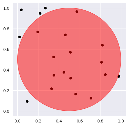 c = Circle(xy=(0.5, 0.5), radius=0.5, alpha=0.5, color='red') # 圆for _ in range(20):x = random.random()y = random.random()plt.scatter(x, y, s=30, color='black')axes2.add_patch(c)