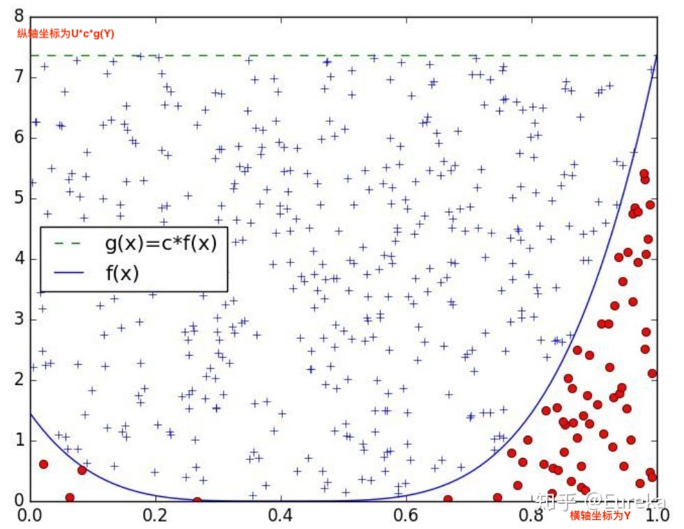 在f(y)下方的点(o形状)满足接受条件,在f(y)上方的点(+形状)不满足接受条件。