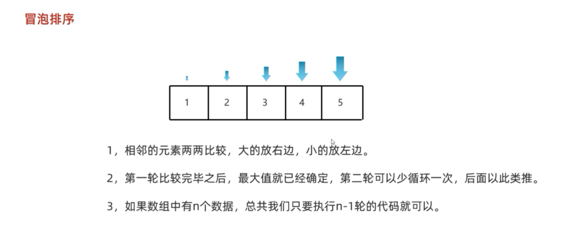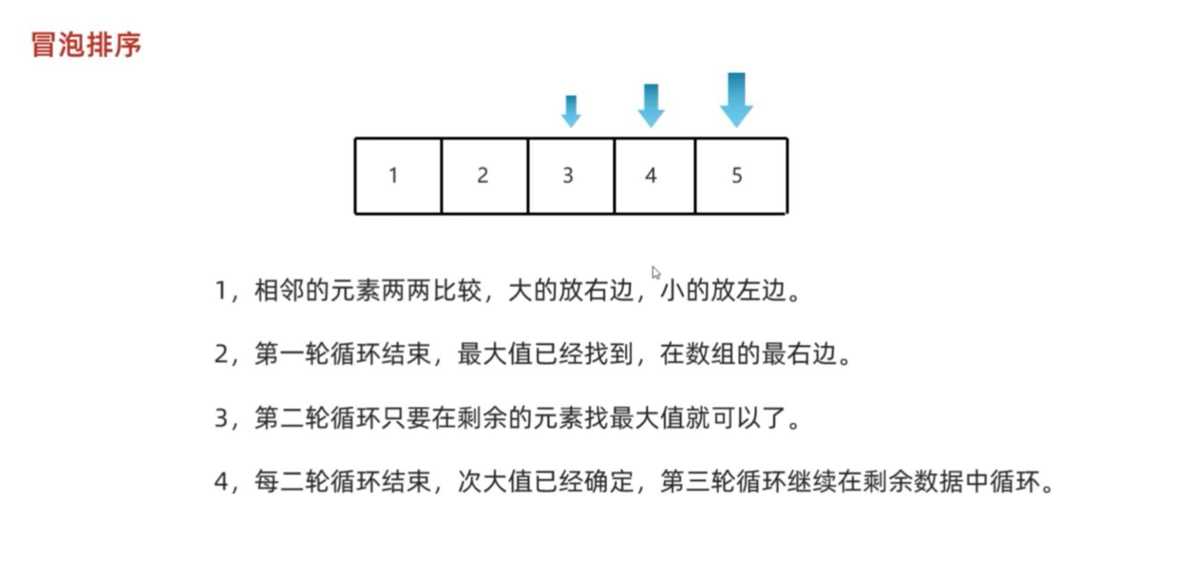 重复遍历待排序数组,依次比较相邻元素,若顺序错误就交换它们。每一轮“冒泡”后,最大(或最小)的元素会像气泡一样“浮”到数组末尾。