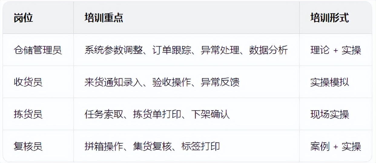 关键节点1:理论培训。讲解一体化逻辑(ERP与WMS数据同步规则)、岗位操作标准(验收时需核对批号/效期)、异常处理流程(拣货差异需上报管理员);