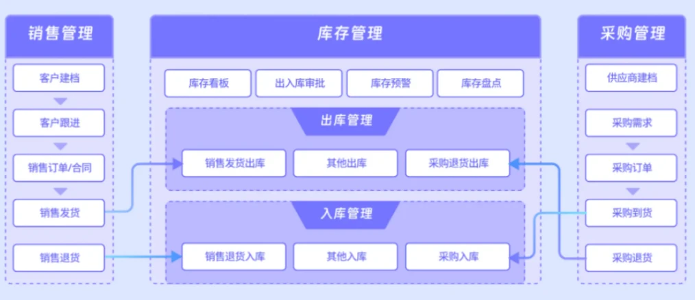 库存协同:WMS实时跟踪货架库存→同步ERP商品账→ERP根据库存数据生成采购或补货计划→WMS接收指令执行补货。