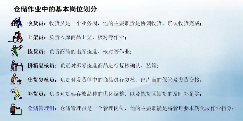 岗位分工明确:设置收货员、上架员、拣货员、复核员等岗位,明确职责与操作标准。