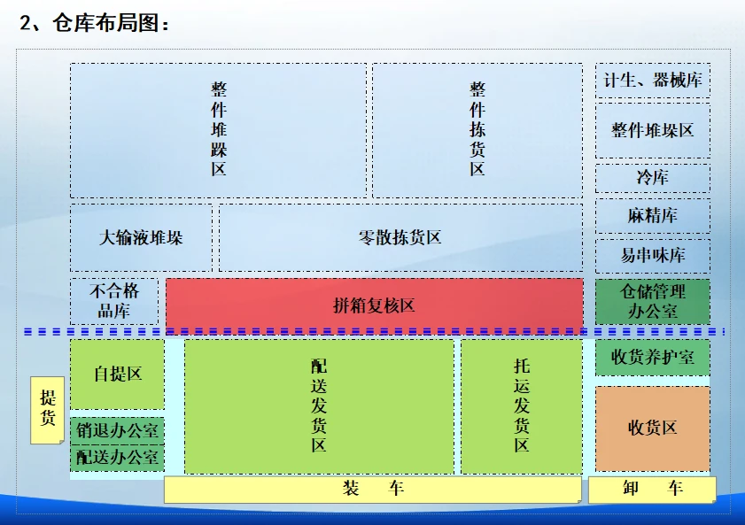 库房规划:按仓库布局图划分功能区(收货区、拣货区、集货区、不合格品库),设计储位编码规则(如“CL1-01-001”:拆零一区-第1排-001位);