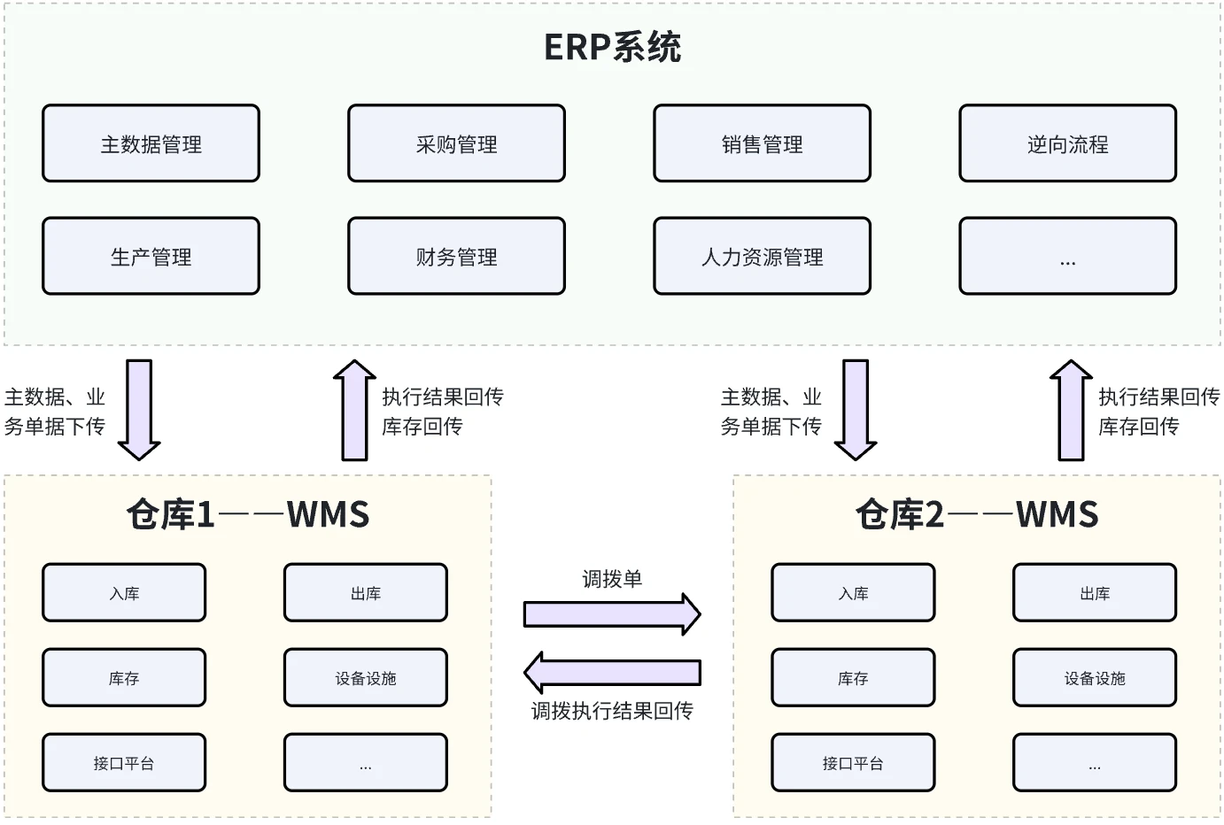 流程延伸:ERP的业务流程延伸至仓储现场,WMS新增上架、下架等专属作业环节,形成“ERP计划发起-WMS执行落地”的完整链路。