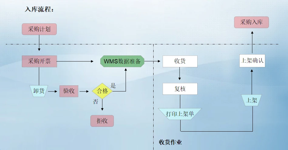业务流程:设计从“ERP计划→WMS执行→数据回传”闭环流程(比如常见入库流程:ERP采购订单→WMS验收→上架→同步ERP库存);
