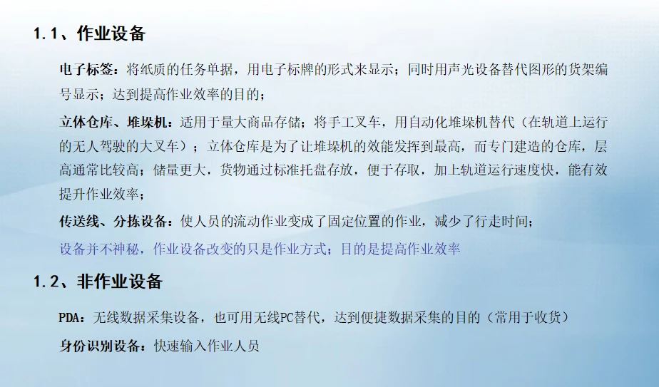 设备:盘点现有硬件(叉车、PDA、电子标签、货架),确认是否需新增/适配;