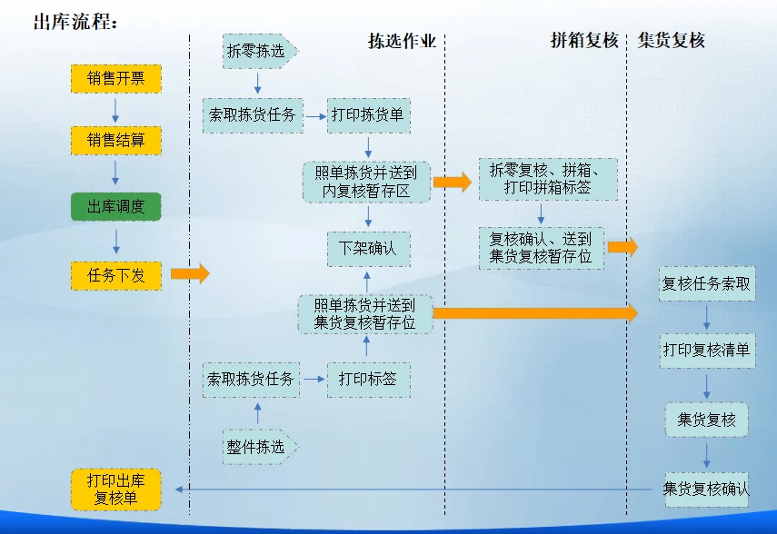 出库协同:ERP整合销售订单→按优先级排序→WMS生成拣货任务→拣货员按指令作业→复核拼箱→出库确认→反馈ERP完成结算。