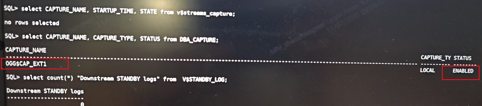 select CAPTURE_NAME, STARTUP_TIME, STATE from v$streams_capture;