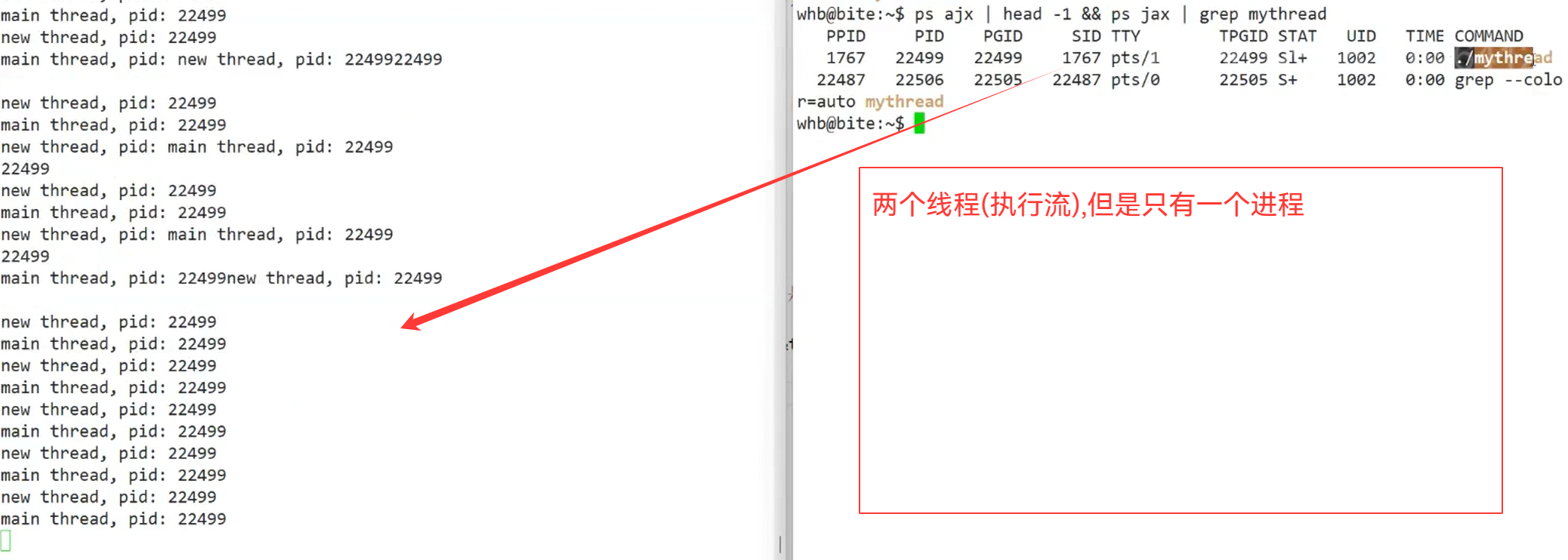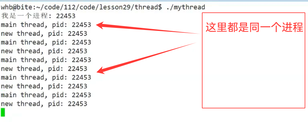 {std::cout << "我是一个进程: " << getpid() << std::endl;pthread_t tid;pthread_create(&tid,nullptr,run,(void*)"thread-1");//主线程while(true){std::cout << "main thread, pid: " << getpid() << std::endl;sleep(1);}return 0;