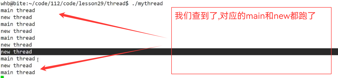 {pthread_t tid;pthread_create(&tid,nullptr,run,(void*)"thread-1");//主线程while(true){std::cout << "main thread" << std::endl;sleep(1);}return 0;