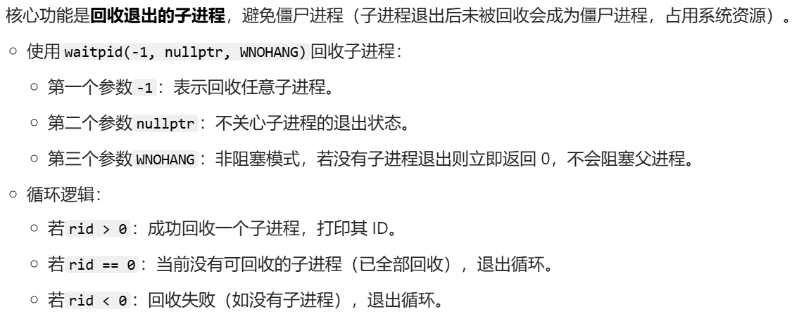 {std::cout << "get a sig: " << signo << std::endl;while(true){pid_t rid = ::waitpid(-1,nullptr,0);if(rid > 0){std::cout << "子进程退出了,回收成功,child id: " << rid << std::endl;}else if(rid < 0){std::cout << "暂时:回收完毕" << std::endl;break;} }