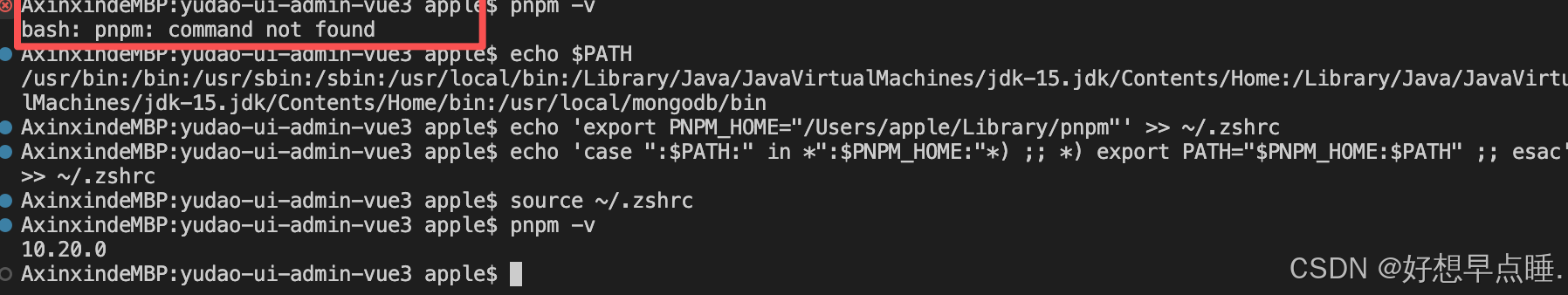 # 查看 PATH 环境变量(看是否包含 /Users/apple/Library/pnpm) echo $PATH# 若不包含,手动添加(临时生效,重启终端后失效,用于测试) export PATH="/Users/apple/Library/pnpm:$PATH"# 再验证 pnpm -v