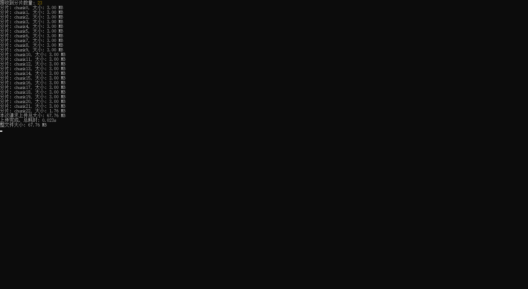 let startTime = null;app.post("/upload", upload.array("chunk"), (req, res) => {if (!startTime) startTime = Date.now();let totalSize = 0;console.log("接收到分片数量:", req.files.length);// 保存分片,同时累加总文件大小req.files.forEach((file) => {const targetPath = path.join(__dirname, "uploads", file.originalname);fs.renameSync(file.path, targetPath); // 保存分片totalSize += file.size;console.log(`分片: ${file.originalname}, 大小: ${(file.size / 1024 / 1024).toFixed(2)} MB`);});console.log(`本次请求上传总大小: ${(totalSize / 1024 / 1024).toFixed(2)} MB`);// 判断是否最后一片,这里假设前端最后一个请求 MD5 最大值已传const md5 = req.body.MD5;if (md5) {const endTime = Date.now();console.log(`上传完成,总耗时: ${(endTime - startTime) / 1000}s`);console.log(`整文件大小: ${(totalSize / 1024 / 1024).toFixed(2)} MB`);startTime = null;}res.json({ code: 0, msg: "分片上传成功" });
