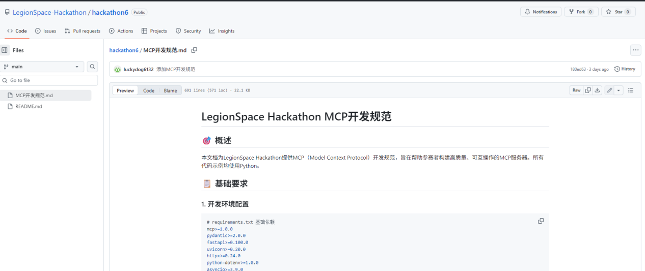 - MCP开发:参阅赛事官方代码库:https://github.com/LegionSpace-Hackathon/hackathon6中的MCP开发规范: