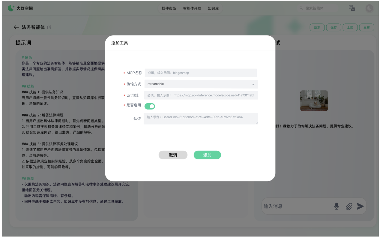 - MCP连接智能体:在大群空间(LegionSpace)中构建使用MCP功能的智能体,在智能体编排过程中调用MCP: