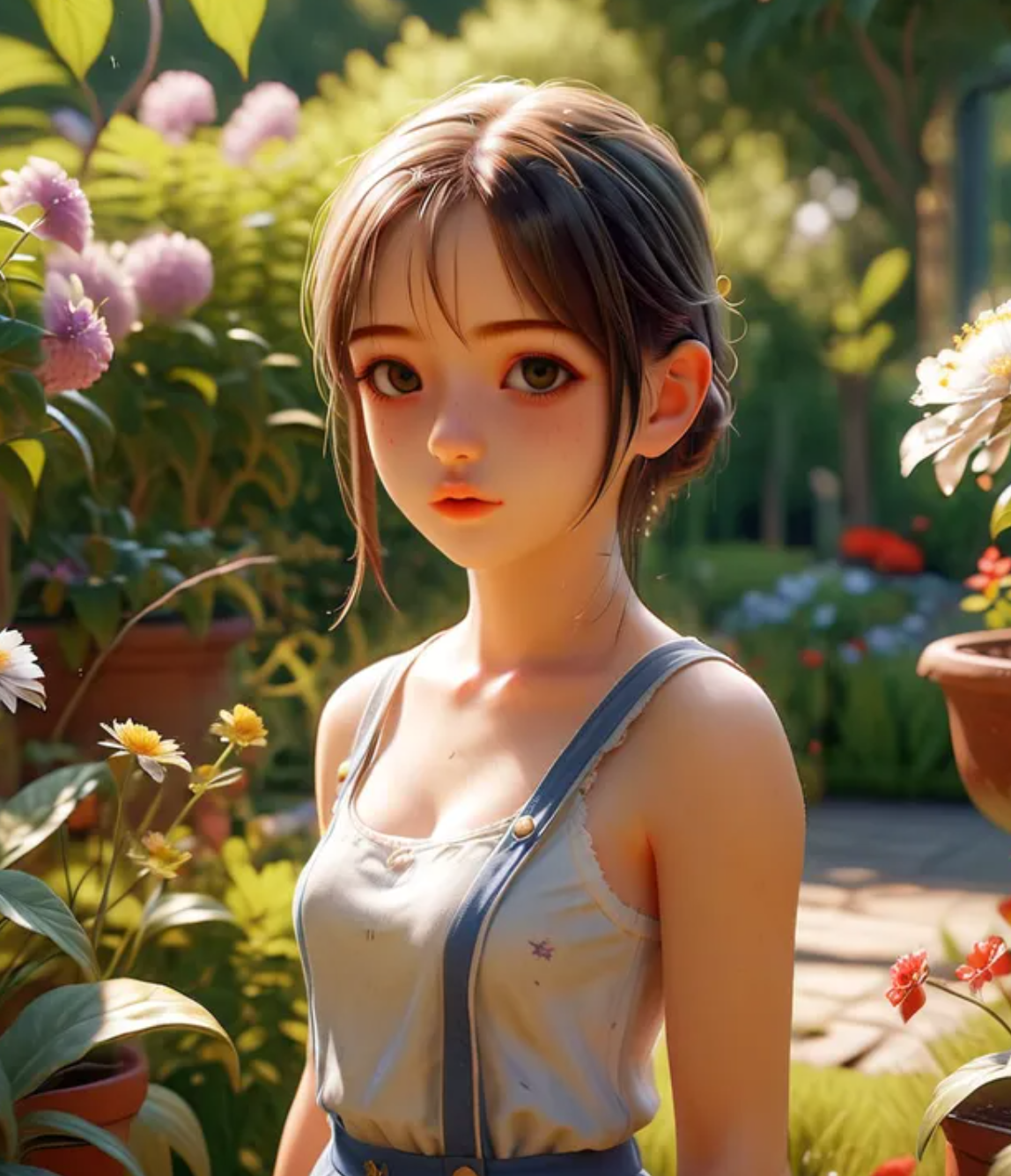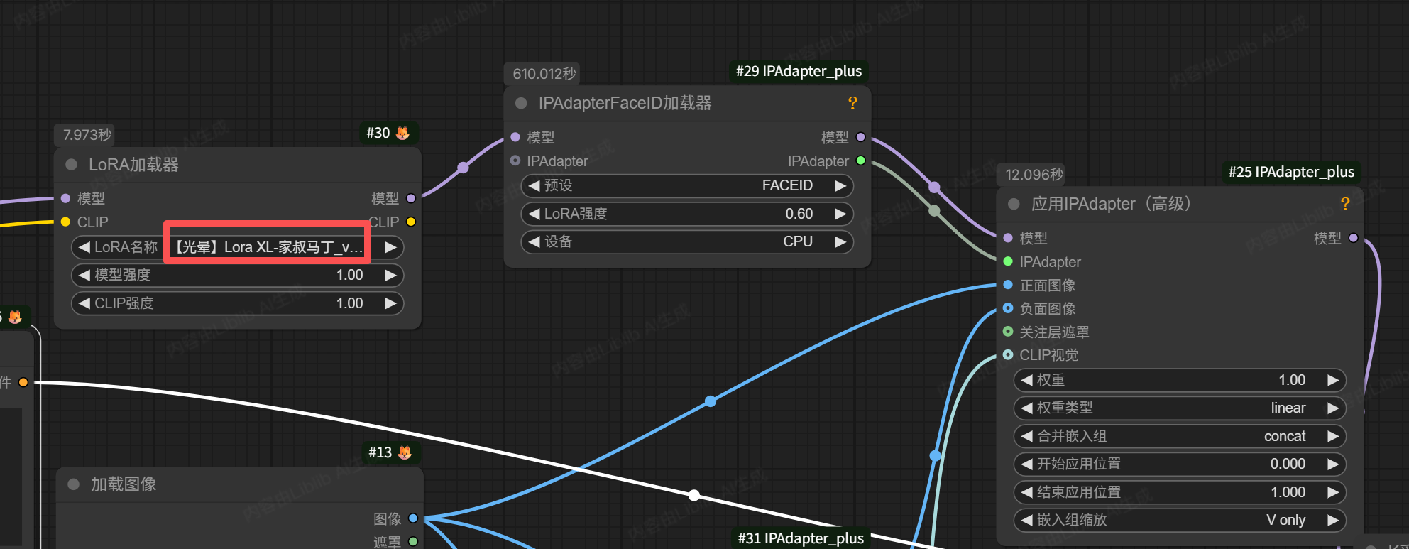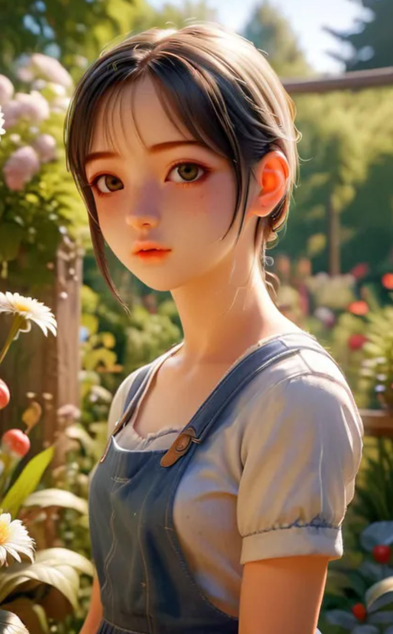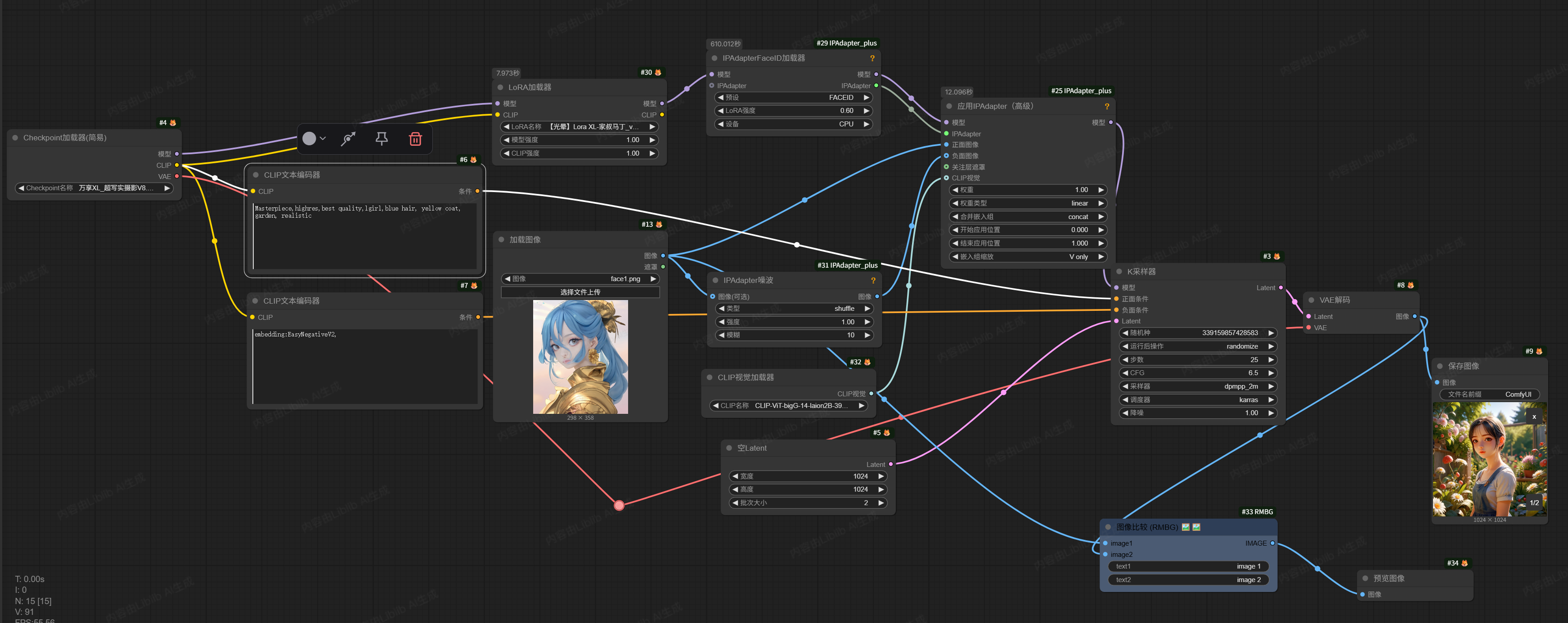 希望实现的效果是,她在公园里,有光照着她。上次其实说过,有光照这个效果,完全可以用lora 来帮忙处理调参。于是我们用 ipadapter组件,捕捉人物特征,并将其置于在花园中即可。