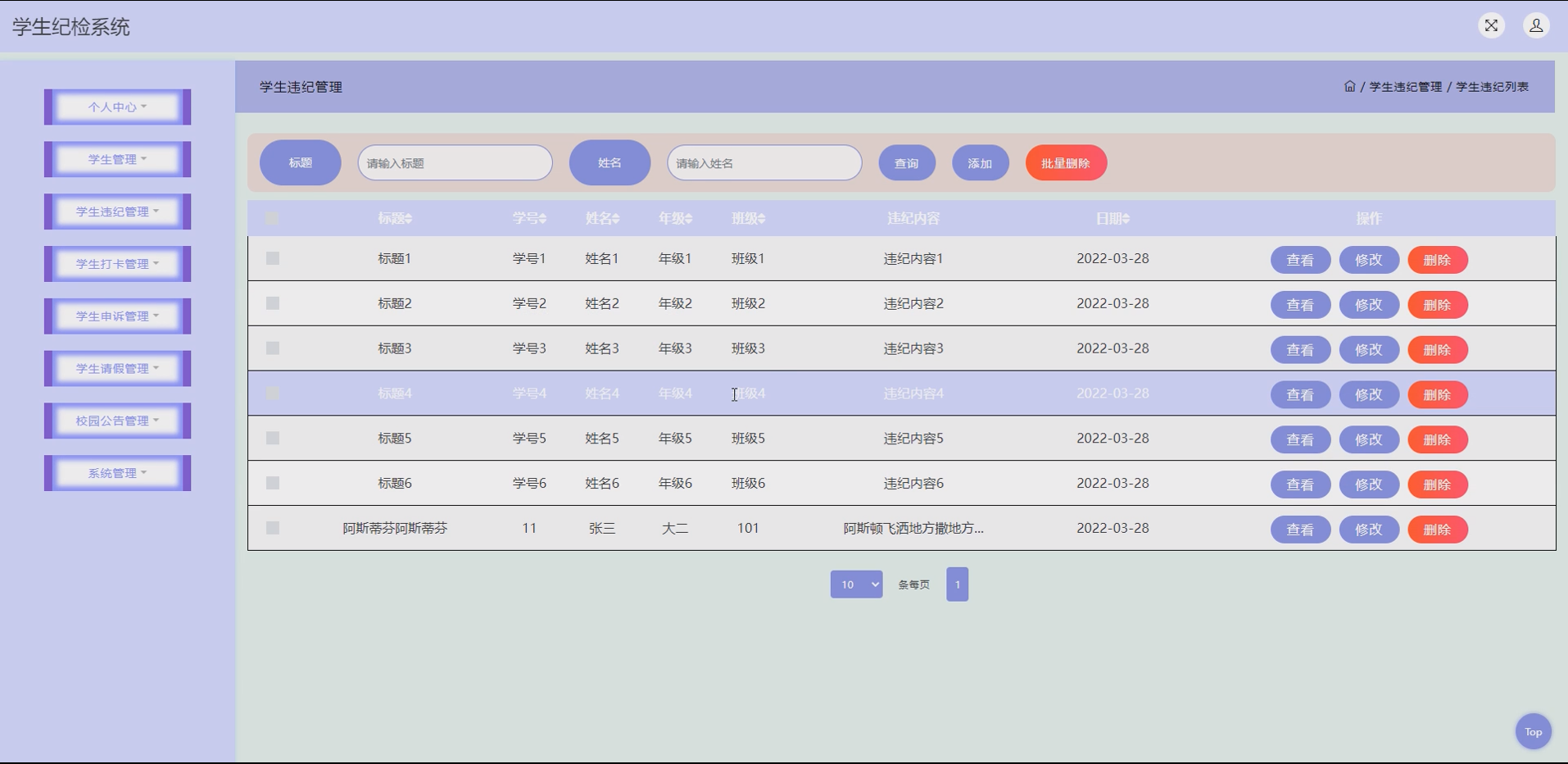 随着高校招生规模的不断扩大,学生数量持续增长,学生日常行为规范管理、纪律检查工作的复杂度和工作量也随之提升。传统的学生纪检管理方式多依赖人工记录、纸质档案存储,存在信息查询不便、统计效率低、数据可视化程度差等问题,难以满足高校精细化、高效化管理的需求。