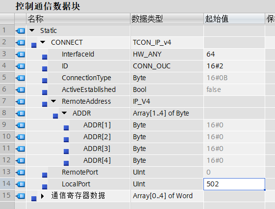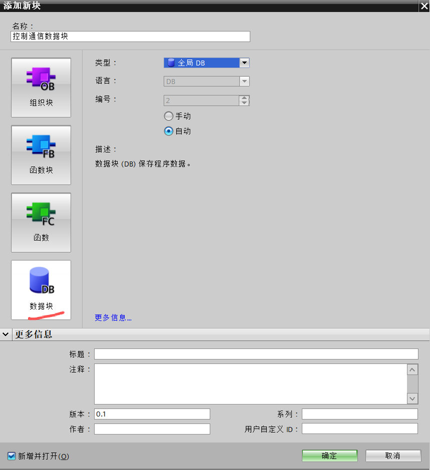 1、新建包含控制数据与通信数据的数据块