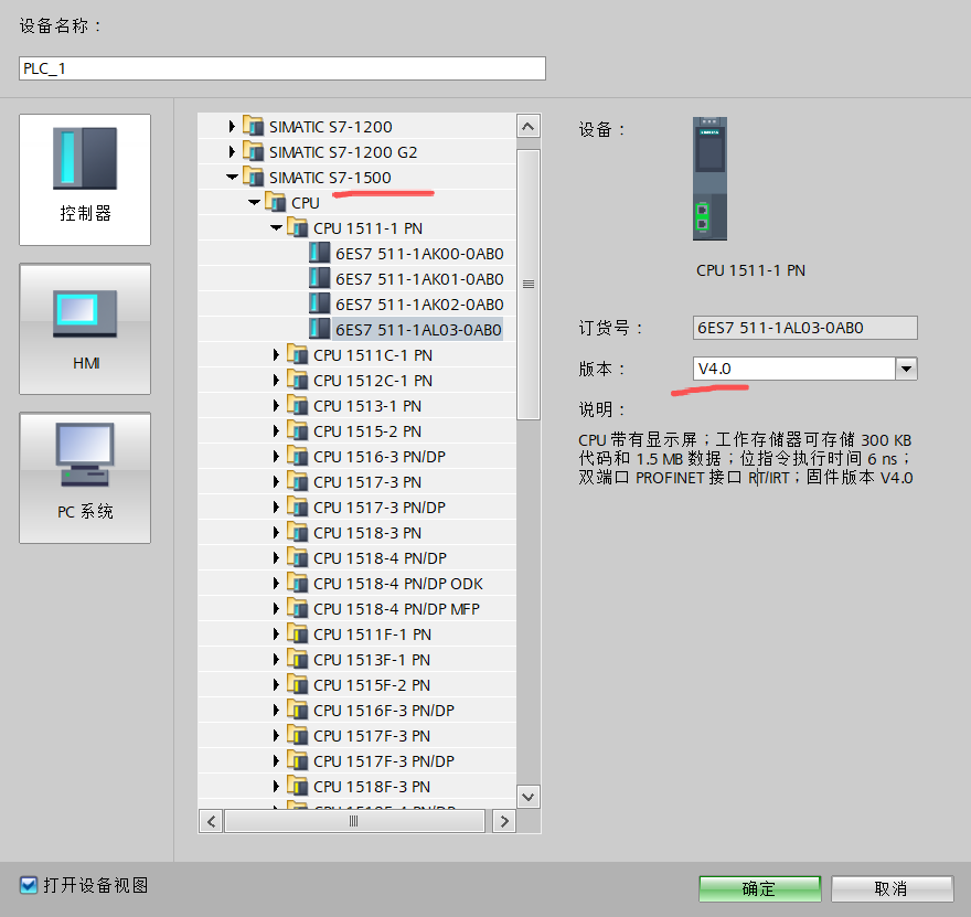 一定要选1500PLCcpu,PLCSIM-Advanced只支持1500PLC,CPU版本选固件4.0及以上的,低的可能不行,不太确定。