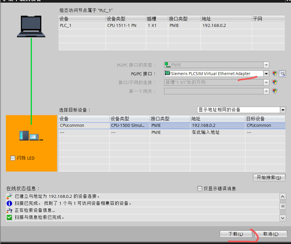 下载时,PG/PC接口选择仿真软件的虚拟网卡。