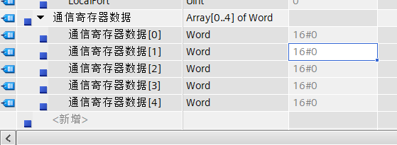 在DB块中添加包含5个WORD的数组,ArrayofWORD,因为Modbus一个寄存器是16位的,用来实现数据传输。