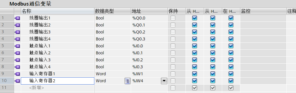 3、添加线圈,触点、输入数据寄存器通信变量