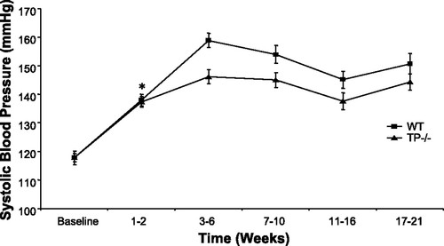图 1. Systolic blood pressures during L-NAME and high-salt administration.