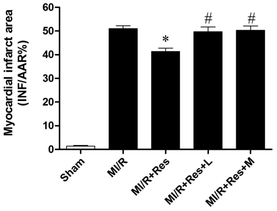 图 2. 白藜芦醇抑制SD大鼠心肌I/R模型中的梗塞比例[7]