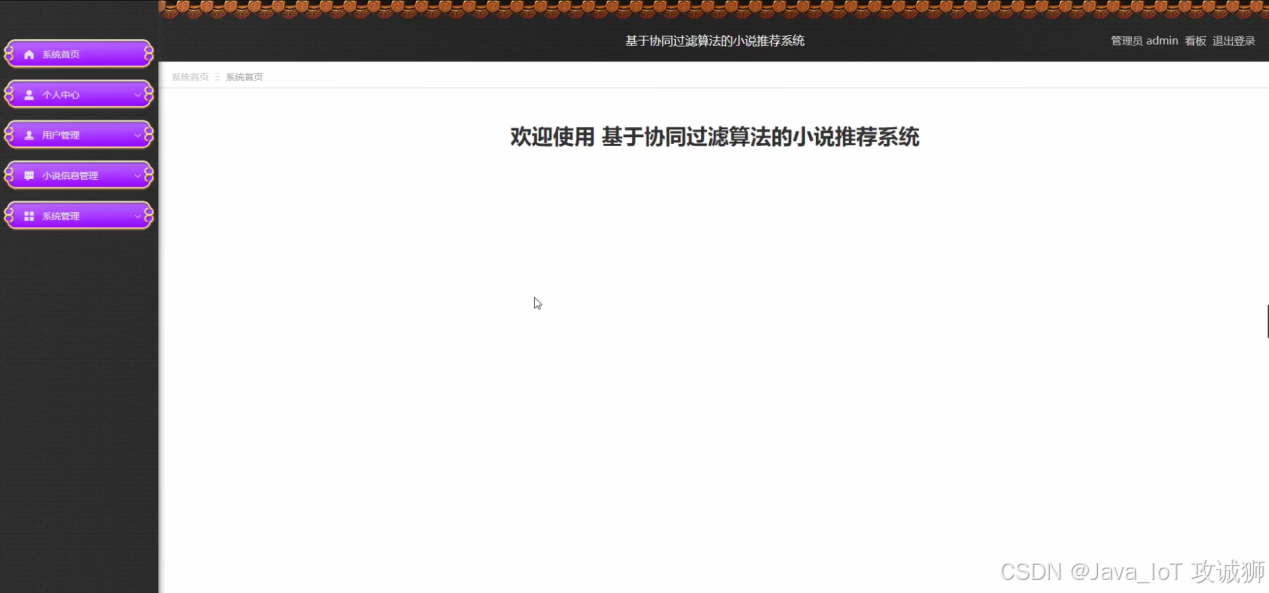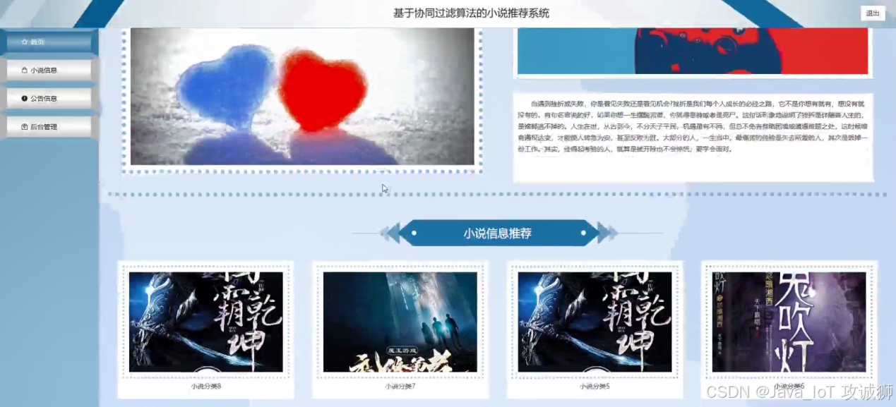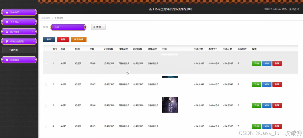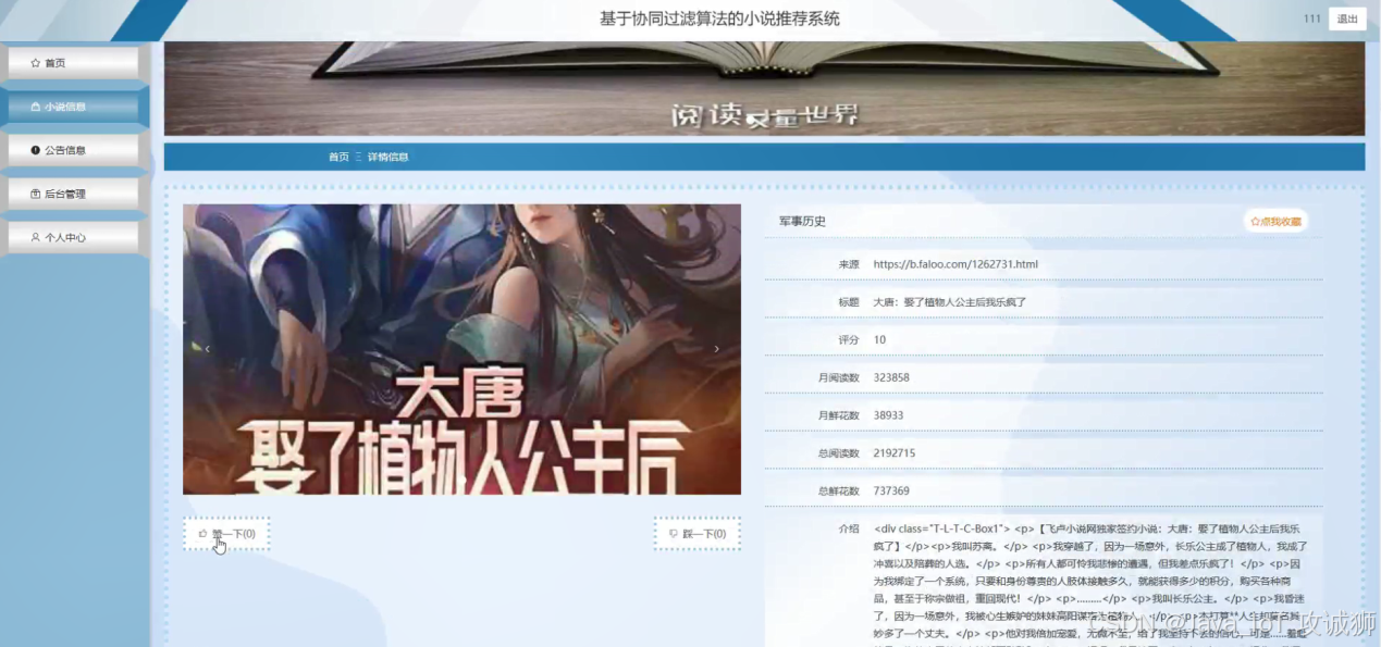 本文设计实现了一个基于协同过滤算法的小说推荐系统,该系统以python进行开发,使用Django后端框架,MySQL为数据库。本系统主要包括对个人中心、用户管理、小说信息管理、系统管理等功能进行操作。