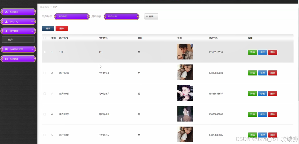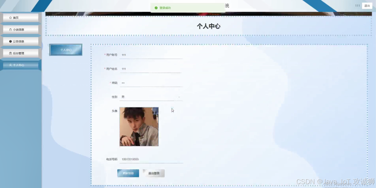 当人们打开系统的网址后,首先看到的就是首页界面。在这里,人们能够看到系统的导航条,通过导航条导航进入各功能展示页面进行操作。在个人中心页面根据需要输入个人详细信息可以进行更新信息操作。管理员进入主页面,主要功能包括对系统首页、个人中心、用户管理、小说信息管理、系统管理等进行操作。