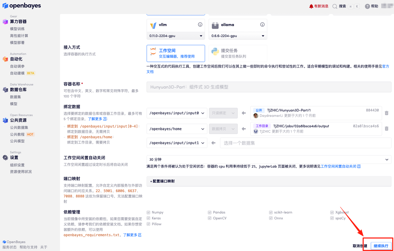 在当前页面中看到的算力资源均可以在平台一键选择使用。平台会默认选配好原教程所使用的算力资源、镜像版本,不需要再进行手动选择。点击「继续执行」,等待分配资源。