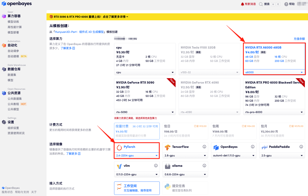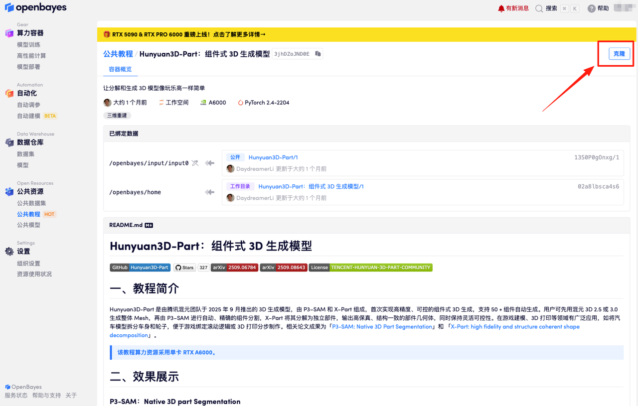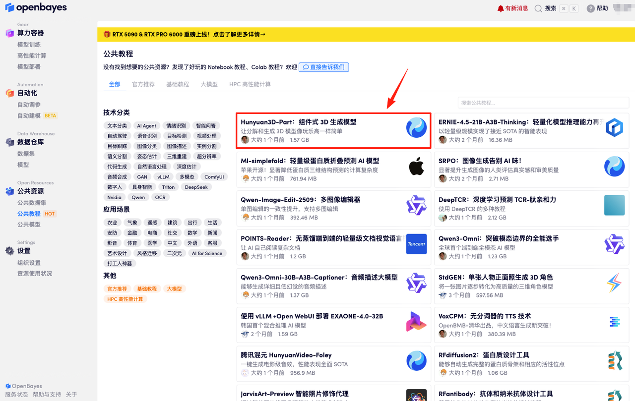 首先点击「公共教程」,找到「Hunyuan3D-Part:组件式 3D 生成模型」,单击打开。