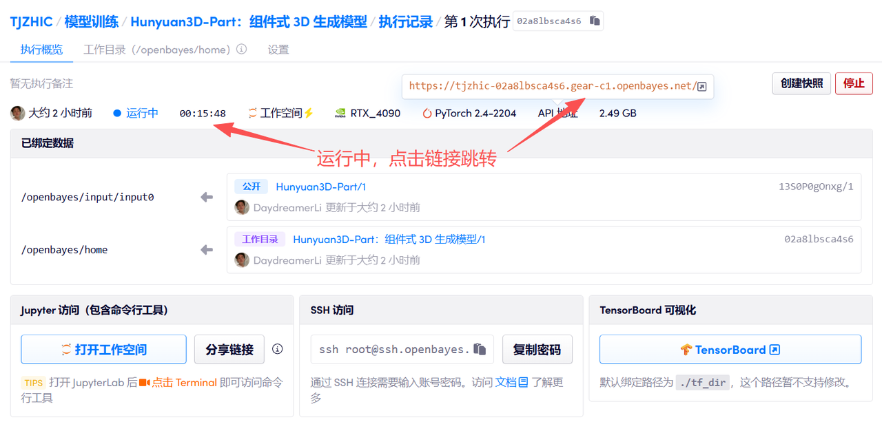 数据和代码都已经同步完成了。容器状态显示为「运行中」后,点击「 API 地址」,即可进入模型界面。