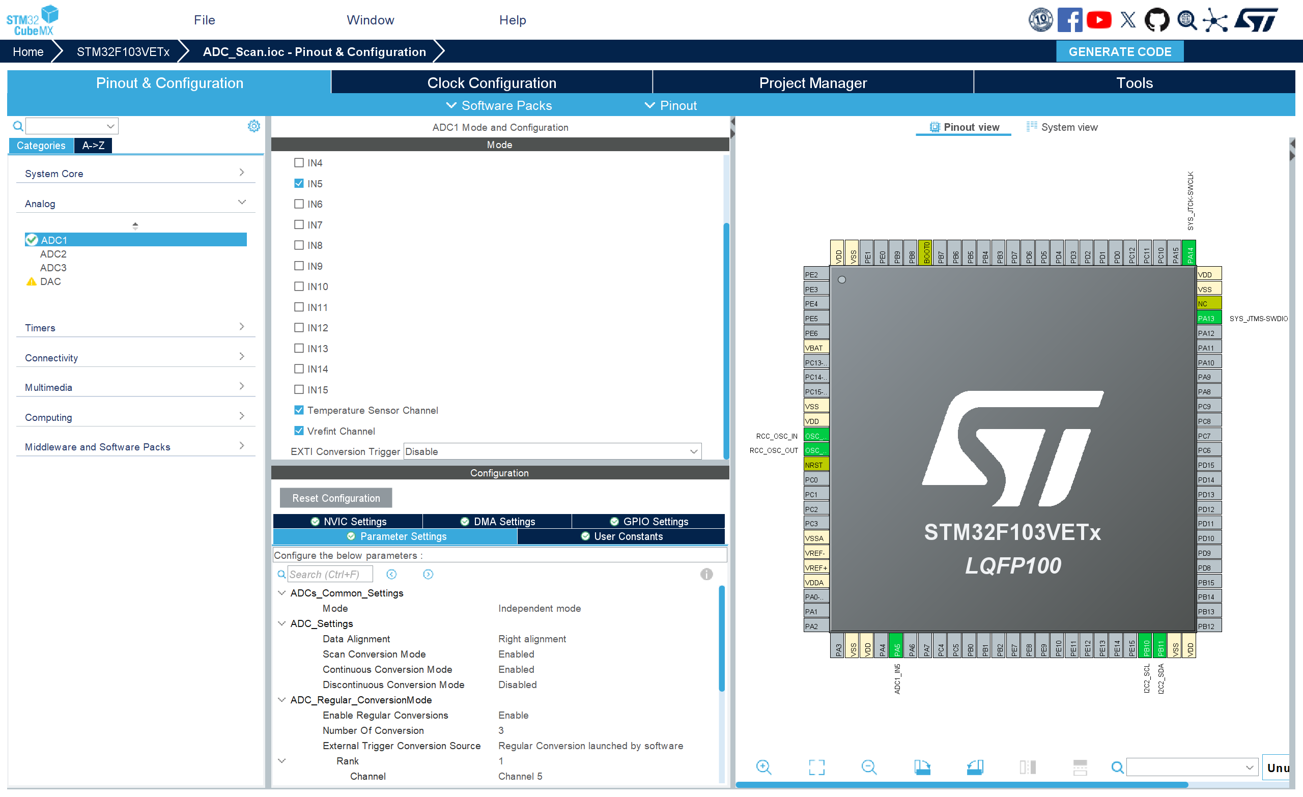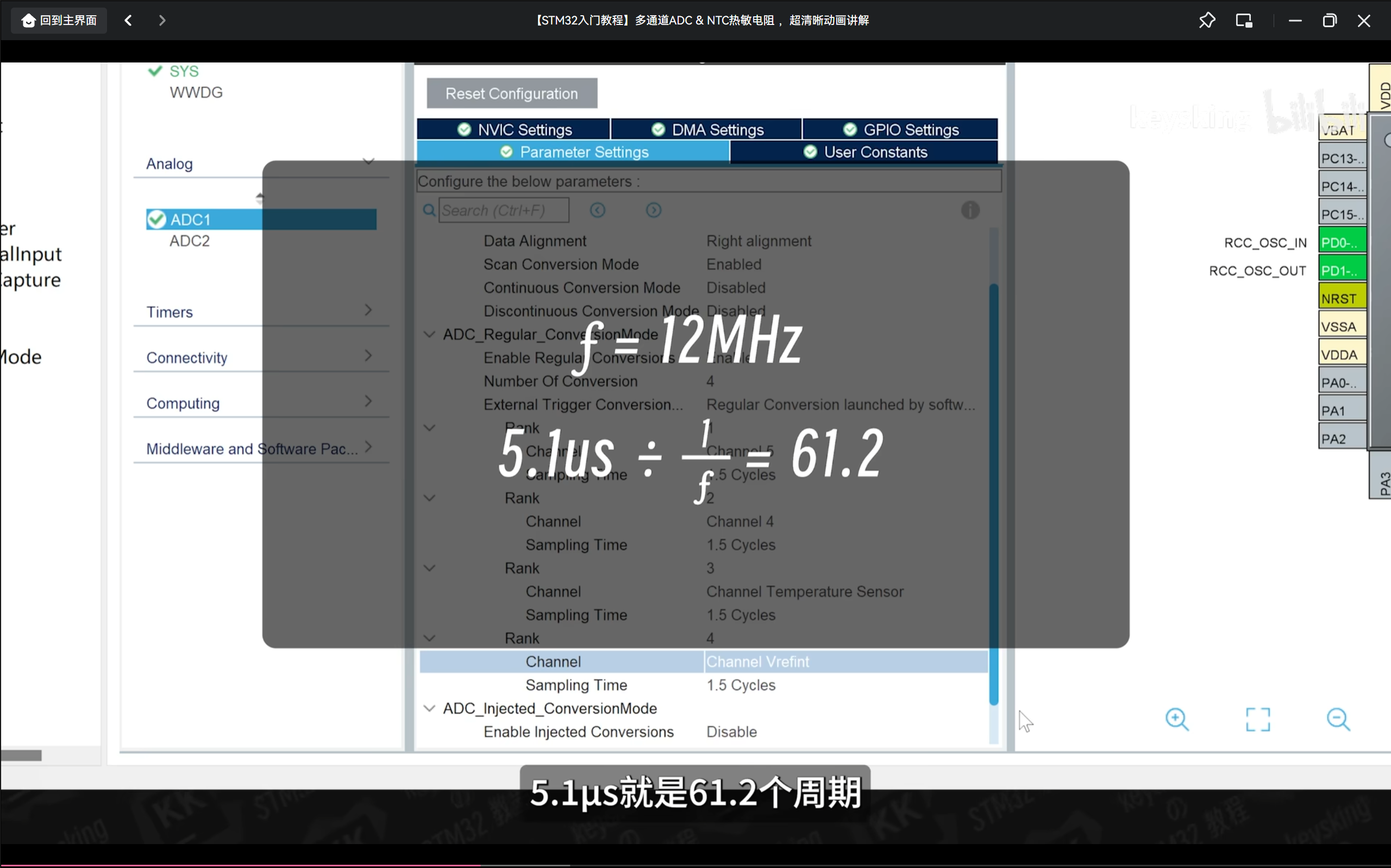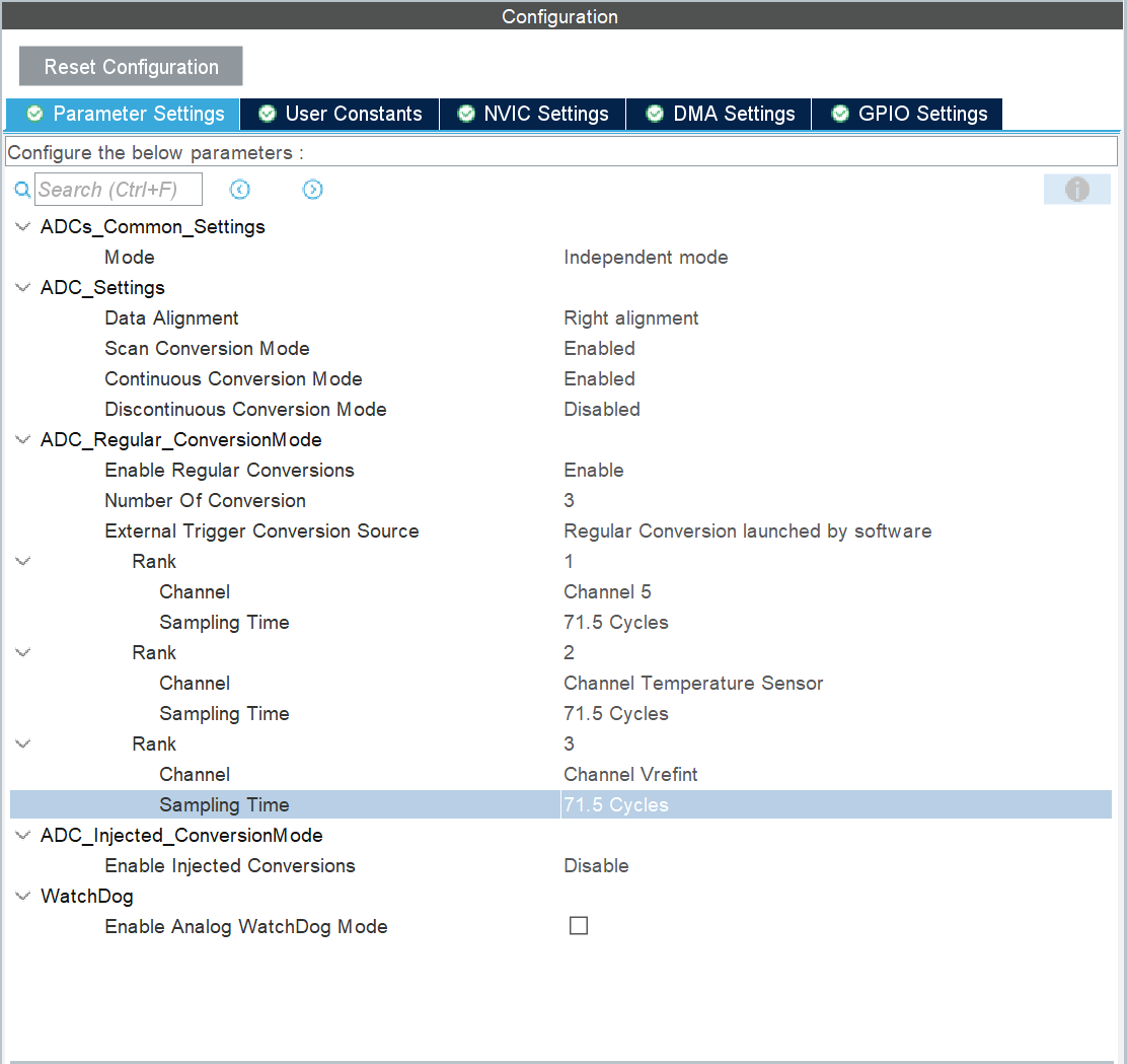这里开启了3个通道,分别为:IN5(PA5引脚外部输入电压);Temperature Sensor Channel(片内温度通道);Vrefint Channel(基准电压通道)