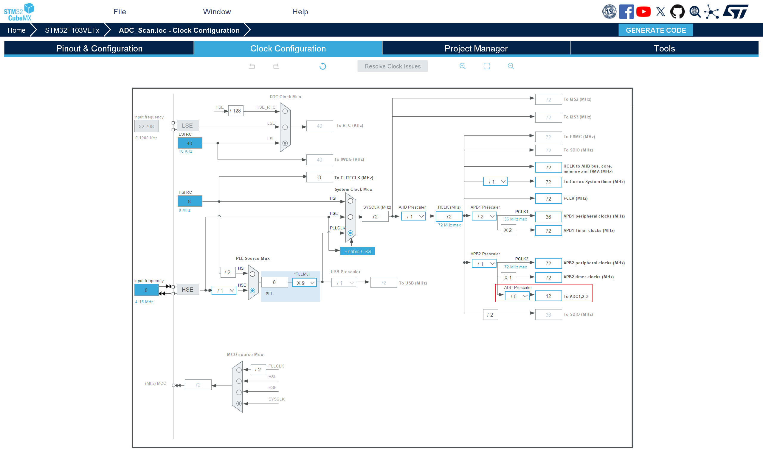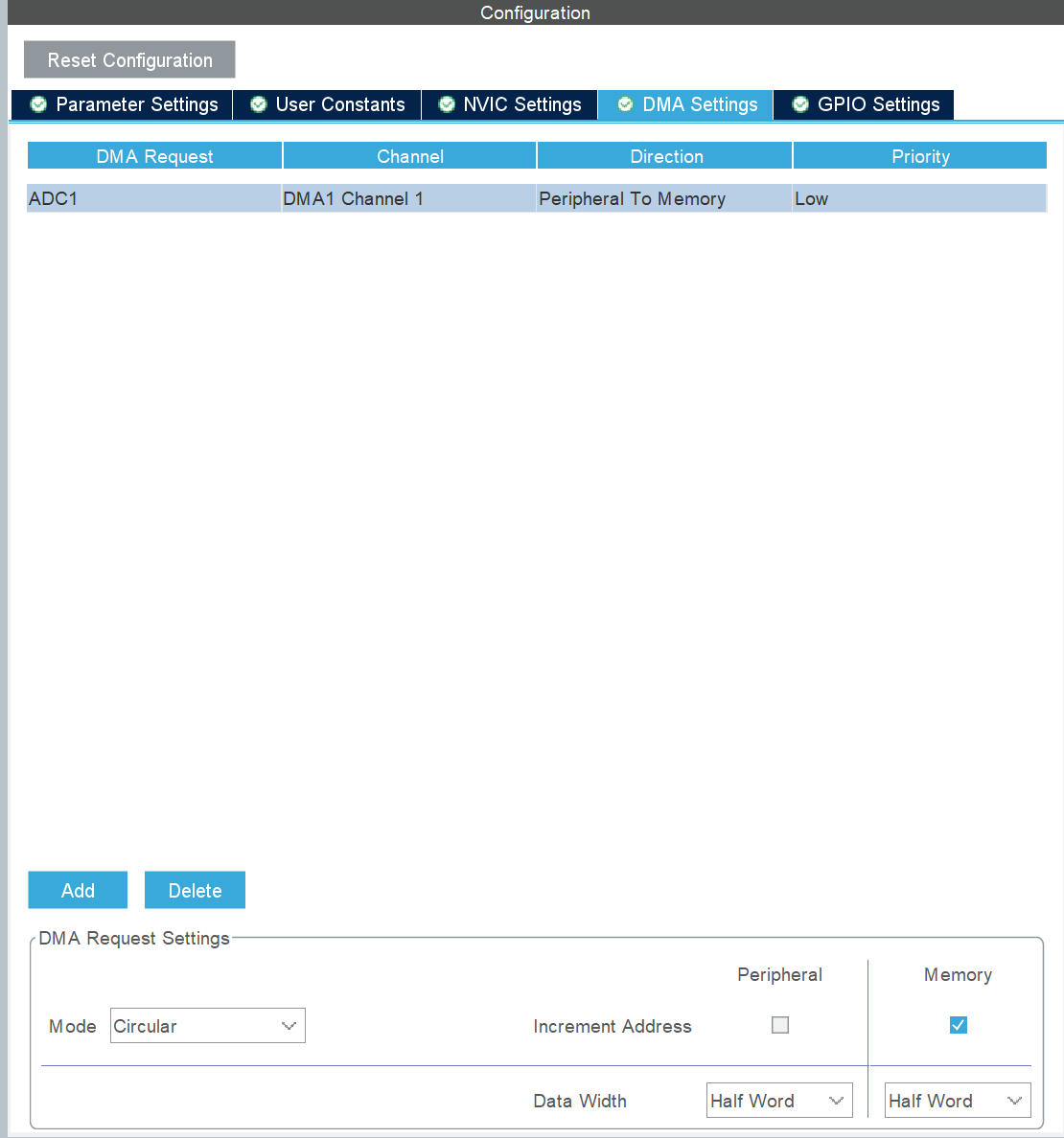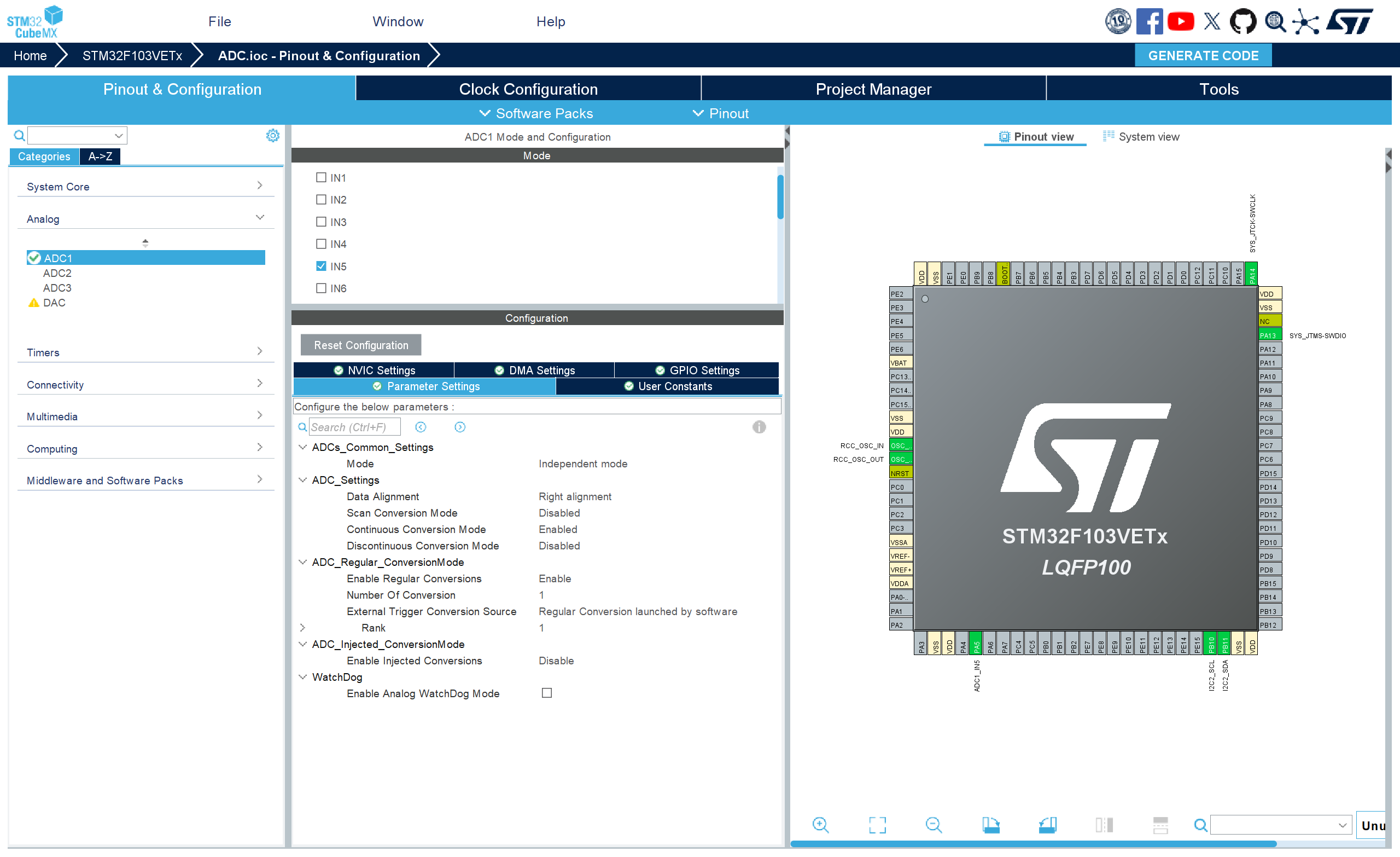 这里开启了3个通道,分别为:IN5(PA5引脚外部输入电压);Temperature Sensor Channel(片内温度通道);Vrefint Channel(基准电压通道)