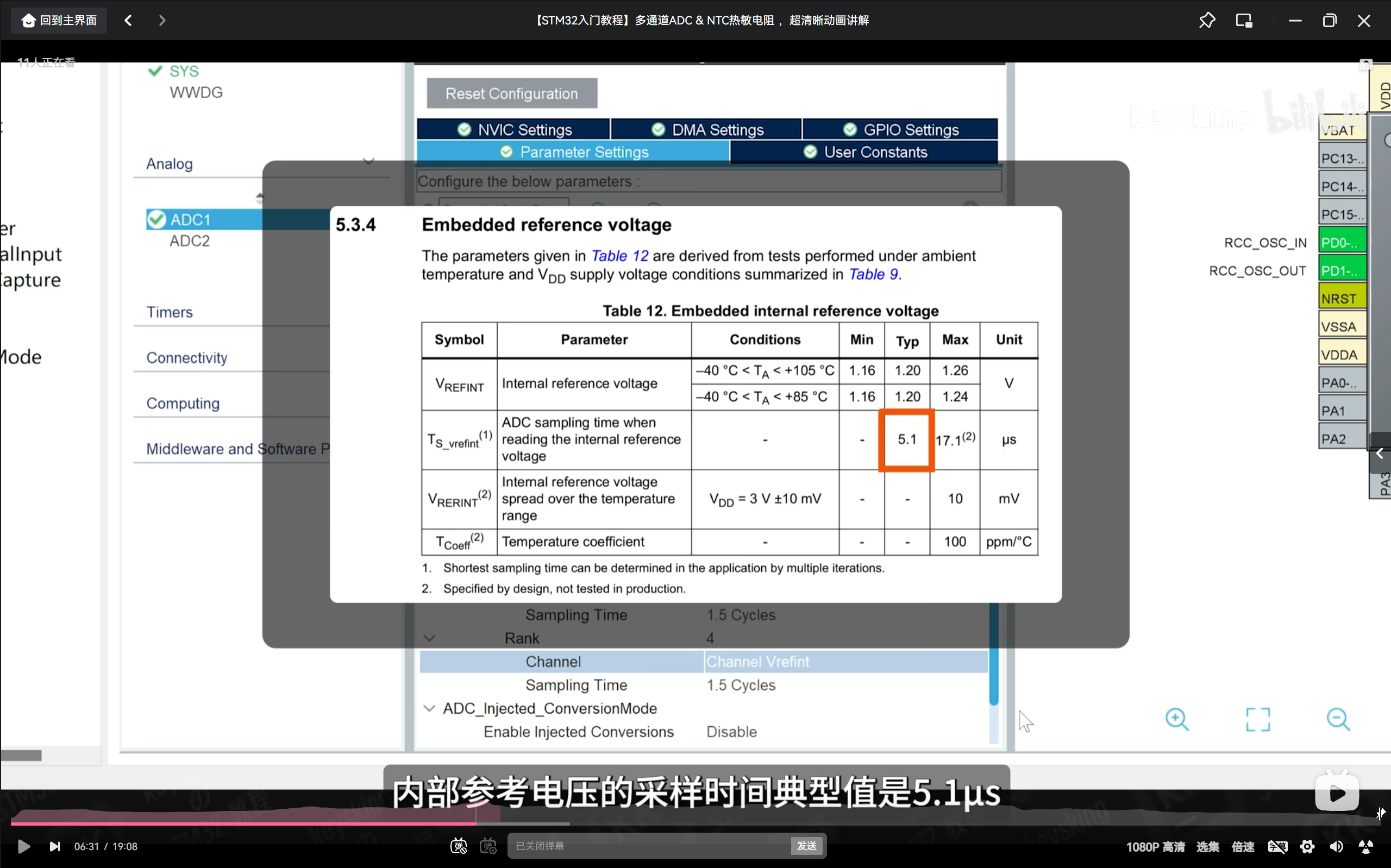 SampLing Time(测量周期):由图4图5可知,内部参考电压测量时间大概为61.2个周期,避免出错,这里设置为71.5个周期。