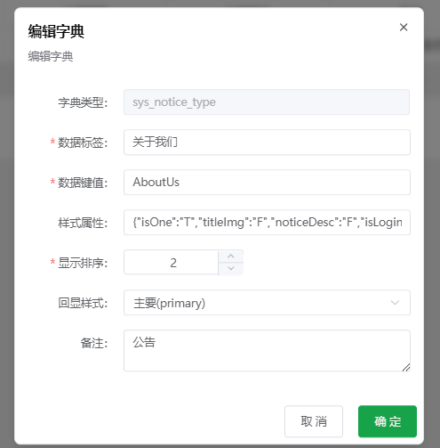 titleImg、noticeDesc通过字典中某个字段的json参数去判断,这里我不想改变字典的参数,我就用了不常用的cssClass字典作为json载体。