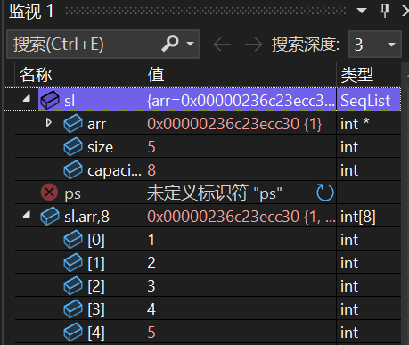 其调试结果如下,可以看见我们的5个元素成功插入到顺序表中: