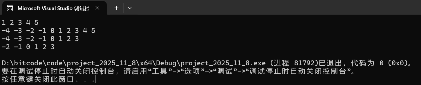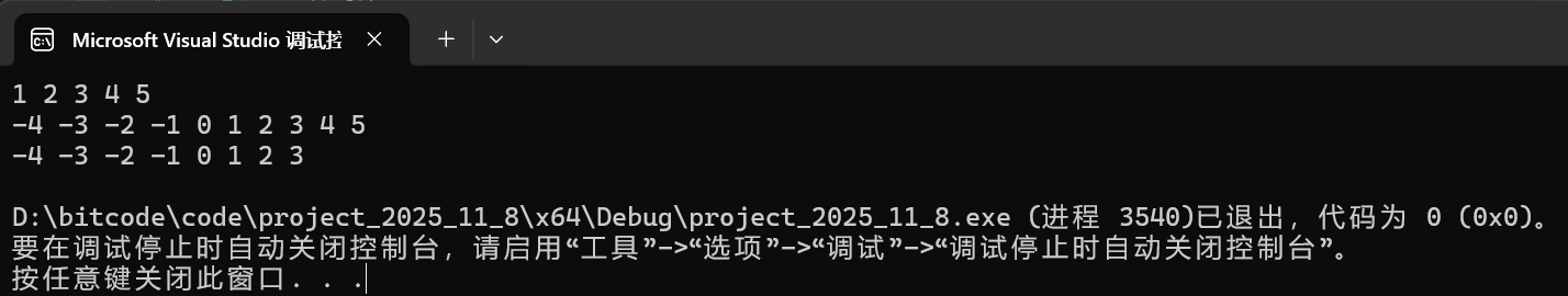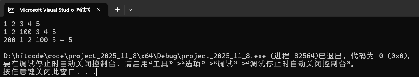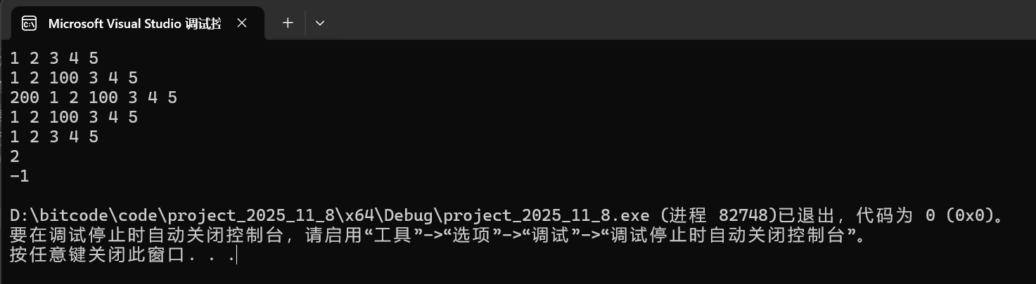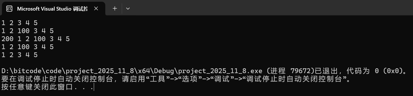 void SLTest02() {SL sl;SLInit(&sl);SLPushBack(&sl, 1);SLPushBack(&sl, 2);SLPushBack(&sl, 3);SLPushBack(&sl, 4);SLPushBack(&sl, 5);SLPrint(&sl);SLInsert(&sl, 2, 100);SLPrint(&sl);SLInsert(&sl, 0, 200);SLPrint(&sl);