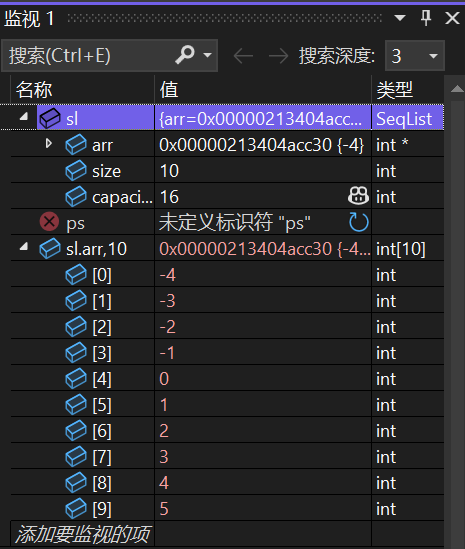 如果说每回运行代码我们都要自己去进行调试监视,那就太麻烦了,所以说我们最好是写一个顺序表元素打印代码,方便我们观察结果: