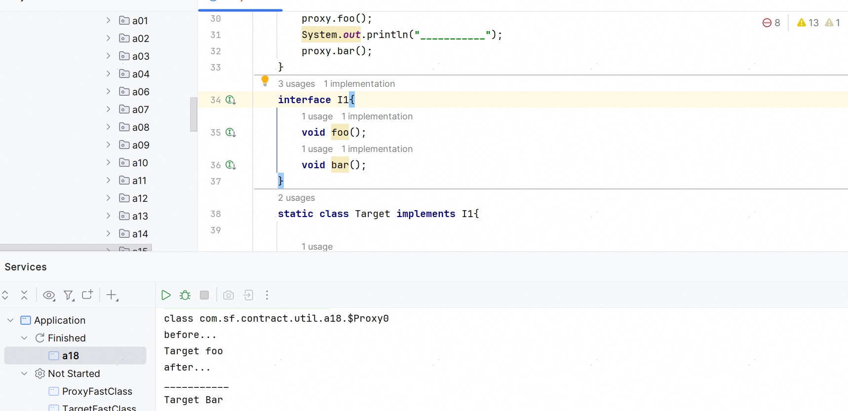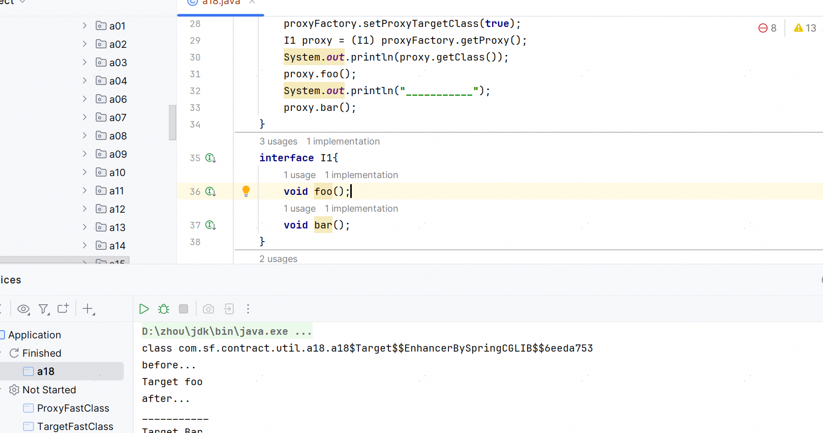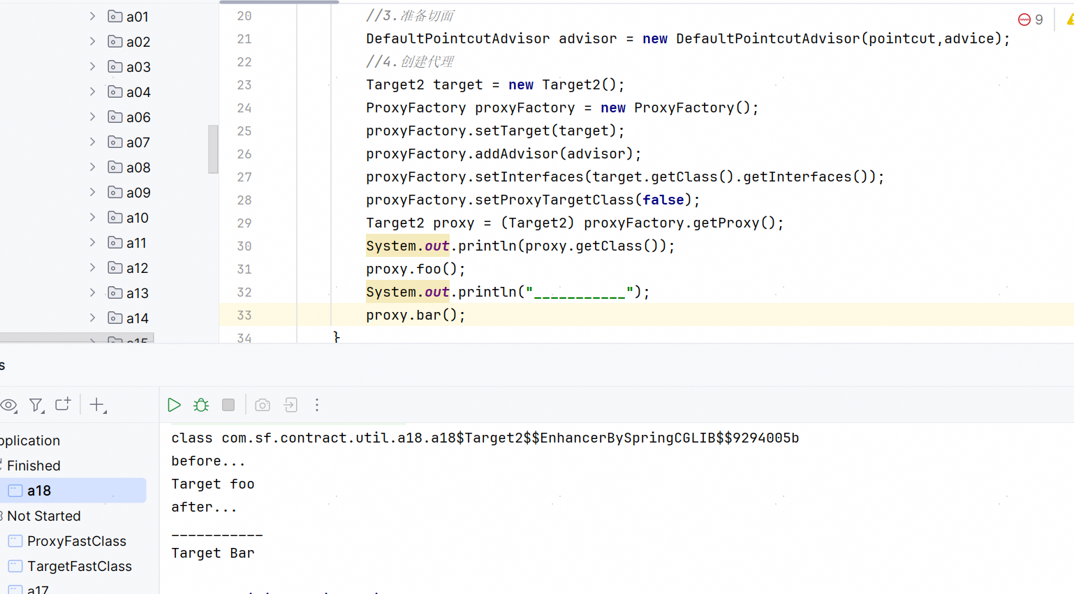 //4.创建代理Target target = new Target();ProxyFactory proxyFactory = new ProxyFactory();proxyFactory.setTarget(target);proxyFactory.addAdvisor(advisor);proxyFactory.setInterfaces(target.getClass().getInterfaces());proxyFactory.setProxyTargetClass(true);I1 proxy = (I1) proxyFactory.getProxy();System.out.println(proxy.getClass());proxy.foo();System.out.println("___________");proxy.bar();