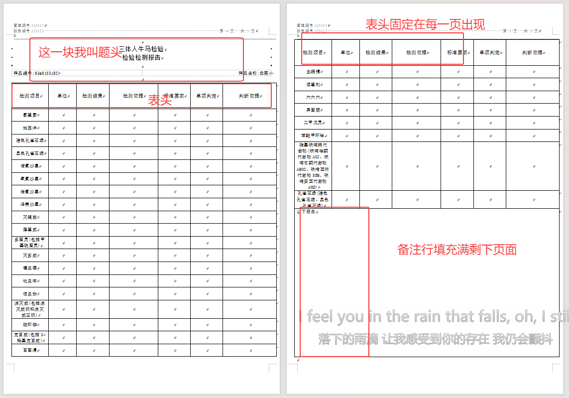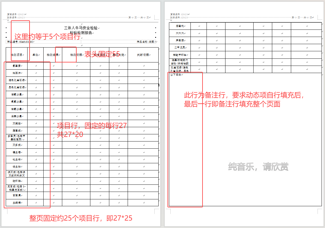先说一下目前所做的表格情况:检测项目是动态的,但是最后一行要求在最后填充整个页面