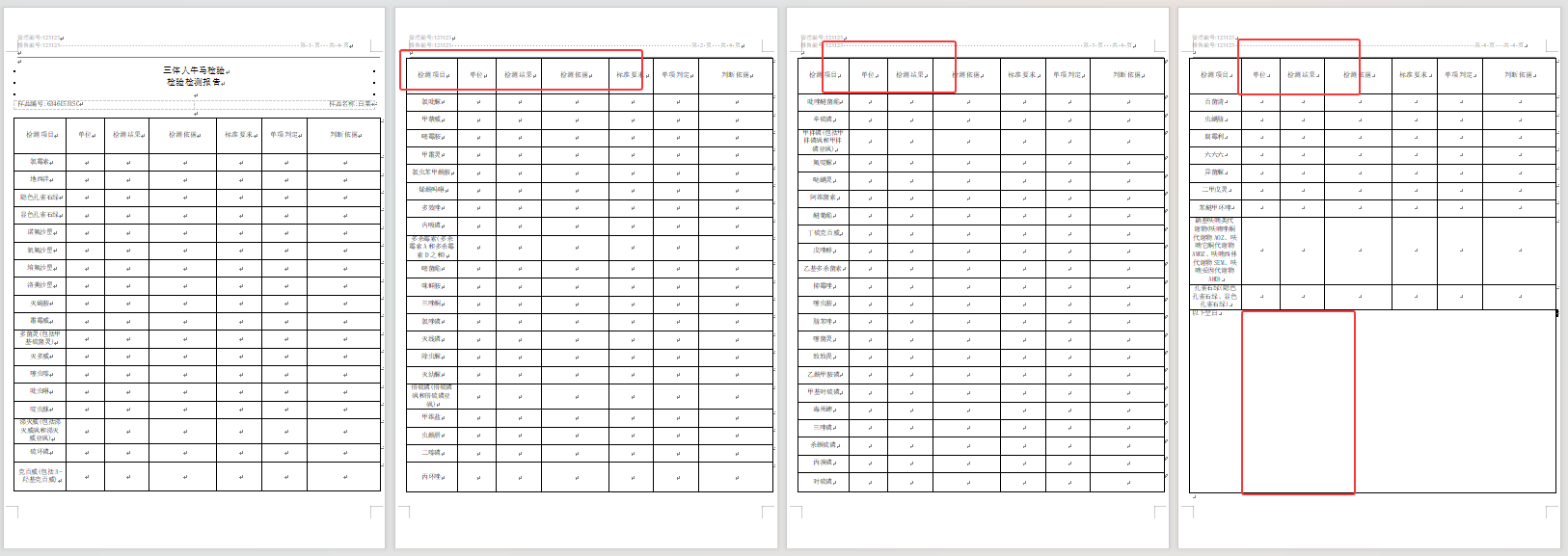 {Aspose.Words.Document doc = new Aspose.Words.Document("xxxxxxxxxxxx");var builder = new DocumentBuilder(doc);int index = 0;int cellFixCout = 6;//一行6列int nowIndex = 0;if (taskModel.agReportDetail_FKs.Count > 0){taskModel.agReportDetail_FKs.ForEach(j =>{int remarkRow = 0;//备注所在行nowIndex++;//插入分页符//builder.InsertBreak(BreakType.SectionBreakNewPage);//会把页码截断builder.InsertBreak(BreakType.PageBreak);//插入纵页builder.PageSetup.Orientation = Aspose.Words.Orientation.Portrait;#region 格式(标题)Aspose.Words.Font font = builder.Font;font.Size = 14;font.Bold = false;font.Color = System.Drawing.Color.Black;font.Name = "宋体";ParagraphFormat paragraphFormat = builder.ParagraphFormat;paragraphFormat.Alignment = ParagraphAlignment.Center;paragraphFormat.KeepTogether = true;#endregionbuilder.Writeln("人类三体文明牛马质量检测处\r\n检验检测报告\r\n");#region 格式(编号、名称)builder.Font.Size = 10;builder.Font.Name = "宋体";builder.Font.Bold = false;#endregionvar table = builder.StartTable();builder.ParagraphFormat.ClearFormatting();builder.InsertCell();// 编号左对齐builder.CellFormat.Width = 285; // 设置单元格宽度builder.ParagraphFormat.Alignment = ParagraphAlignment.Left;builder.Write($"编号:NM0000123");// 名称右对齐builder.InsertCell();builder.CellFormat.Width = 285;builder.ParagraphFormat.Alignment = ParagraphAlignment.Right;builder.Write($"名称:牛马");builder.EndRow();builder.EndTable();// 隐藏所有边框table.SetBorders(Aspose.Words.LineStyle.None, 0, Color.Black);// 开始构建表Aspose.Words.Tables.Table tableNow = builder.StartTable();#region 格式(表头)//设置高度并定义标题行的高度规则。builder.RowFormat.Height = 55;builder.RowFormat.HeightRule = HeightRule.AtLeast;builder.ParagraphFormat.ClearFormatting();builder.ParagraphFormat.Alignment = ParagraphAlignment.Center;int projectFontsize = 10;builder.Font.Size = 11;builder.Font.Name = "宋体";builder.Font.Bold = false;builder.CellFormat.VerticalAlignment = CellVerticalAlignment.Center;//我们不需要指定此单元格的宽度,因为它是从前一个单元格继承的。#endregion//builder.RowFormat.HeadingFormat = true;builder.InsertCell();builder.Write("检测项目");builder.InsertCell();builder.Write("单位");builder.InsertCell();builder.Write("检测结果");builder.InsertCell();builder.Write("检测依据");builder.InsertCell();builder.Write("标准要求");builder.InsertCell();builder.Write("单项判定");builder.InsertCell();builder.Write("判断依据");//调用以下方法结束行并开始新行。builder.EndRow();remarkRow++;if (projects.Count > 0){projects.ForEach(project =>{#region 格式(检测项目)//设置高度并定义标题行的高度规则。builder.RowFormat.Height = 27;builder.RowFormat.HeightRule = HeightRule.AtLeast;builder.ParagraphFormat.Alignment = ParagraphAlignment.Center;builder.Font.Size = projectFontsize;builder.Font.Name = "宋体";builder.Font.Bold = false;builder.CellFormat.VerticalAlignment = CellVerticalAlignment.Center;//我们不需要指定此单元格的宽度,因为它是从前一个单元格继承的。#endregionbuilder.InsertCell();builder.Write(project);builder.InsertCell();builder.Write("");builder.InsertCell();builder.Write("");builder.InsertCell();builder.Write("");builder.InsertCell();builder.Write("— —");builder.InsertCell();builder.Write("— —");builder.InsertCell();builder.Write("— —");builder.EndRow();remarkRow++;//备注行后移});}//int allPageRows = 25;//去掉表头(5行)//int finalRow = projects.Count + jcCount + 5 + 1;//整页使用了多少行(按25行的来算)5行:题头+检测项目(3行) 1行:备注所占行//int n = finalRow / allPageRows > 0 ? (finalRow % allPageRows > 0 ? ((finalRow / allPageRows) + 1) : (finalRow / allPageRows)) : 1;//int m = allPageRows * n - finalRow;//还有多少行填满一页#region 格式化(备注行)builder.ParagraphFormat.Alignment = ParagraphAlignment.Left;builder.CellFormat.VerticalAlignment = CellVerticalAlignment.Top;#endregionbuilder.InsertCell();builder.Write("以下空白");for (int ii = 1; ii <= cellFixCout; ii++){builder.InsertCell();}builder.EndRow();#region 设置行高//// 获取页面总高度//double totalPageHeight = newSection.PageSetup.PageHeight;//// 获取上下边距//double topMargin = newSection.PageSetup.TopMargin;//double bottomMargin = newSection.PageSetup.BottomMargin;//// 计算可用高度(实际内容区域)//int usableHeight = (int)(totalPageHeight - topMargin - bottomMargin);////int usableHeight = 675;//(int)(totalPageHeight - topMargin - bottomMargin);////double pageHeight = 540;//一页高675,项目20行共540,表头行55,题头80 110//double usedHeight = tableNow.Rows.Select(h => (Aspose.Words.Tables.Row)h).Sum(h => h.RowFormat.Height) + 80;//int nn = (int)(usedHeight / usableHeight > 0 ? (usedHeight % usableHeight > 0 ? ((usedHeight / usableHeight) + 1) : (usedHeight / usableHeight)) : 1);//double mm = usableHeight * nn - usedHeight;//还有多少高填满一页//var dsgds = ((Aspose.Words.Tables.Row)tableNow.Rows[remarkRow - 1]).RowFormat.Height;//tableNow.Rows[remarkRow].RowFormat.Height = mm;#endregion#region 宽度赋值//设置表格的首选宽度tableNow.PreferredWidth = PreferredWidth.FromPoints(570); // 首选宽度,根据总宽度调整,没有设置就会导致只会按下面比例生成不可控的宽度foreach (Aspose.Words.Tables.Row row in tableNow.Rows){row.Cells[0].CellFormat.Width = 80;row.Cells[1].CellFormat.Width = 60;row.Cells[2].CellFormat.Width = 70;row.Cells[3].CellFormat.Width = 105;row.Cells[4].CellFormat.Width = 70;row.Cells[5].CellFormat.Width = 70;row.Cells[6].CellFormat.Width = 115;}#endregion#region 合并//备注行合并for (int c = 0; c <= cellFixCout; c++){if (c == 0){tableNow.Rows[remarkRow].Cells[c].CellFormat.HorizontalMerge = Aspose.Words.Tables.CellMerge.First;}else{tableNow.Rows[remarkRow].Cells[c].CellFormat.HorizontalMerge = Aspose.Words.