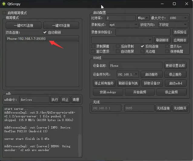点击 "无线连接",然后再次点击 "刷新设备",你会看到一个带IP地址的设备出现,选择它并点击 "启动服务"。