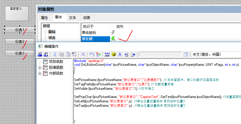 第四步,在每个按钮添加如图脚本,我们在脚本中定义窗口名称,变量前缀。还有获取按钮文本,用作窗口页眉显示。3个仪表都调用这个一个窗口,只需要更改脚本中变量前缀即可。