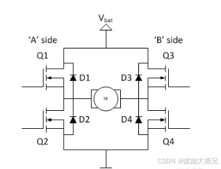 控制逻辑:非常简洁。将同一对开关管(Q1和Q4)作为一组,(Q2和Q3)作为另一组,进行互补导通。