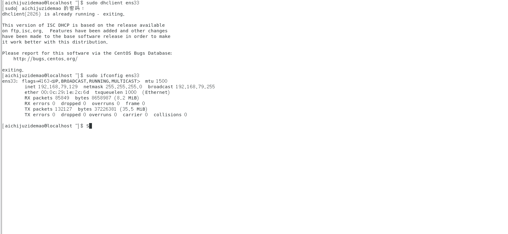 2. 如果ens33未显示inet IP地址则可以通过下列方法尝试解决: